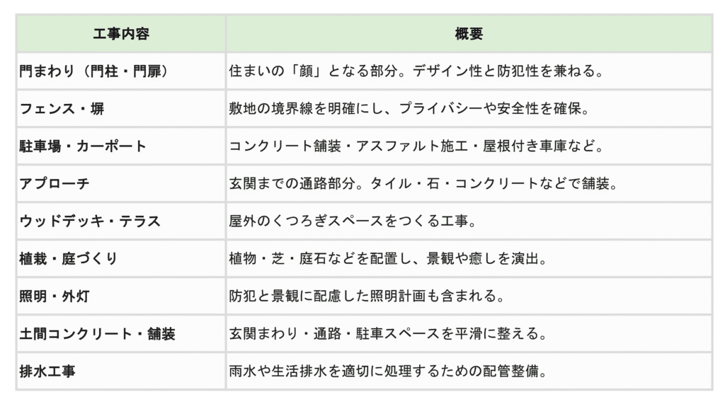外構工事には、門まわり・フェンス・駐車場・庭まわりなど、さまざまな工事が含まれます。