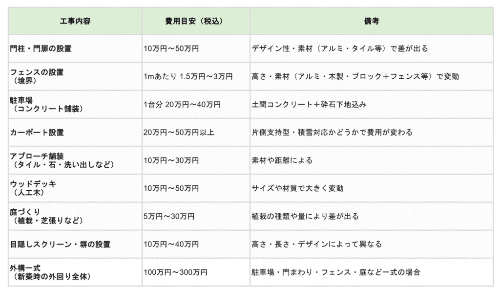 こちらのページでは、代表的な外構工事の費用目安をご紹介します。