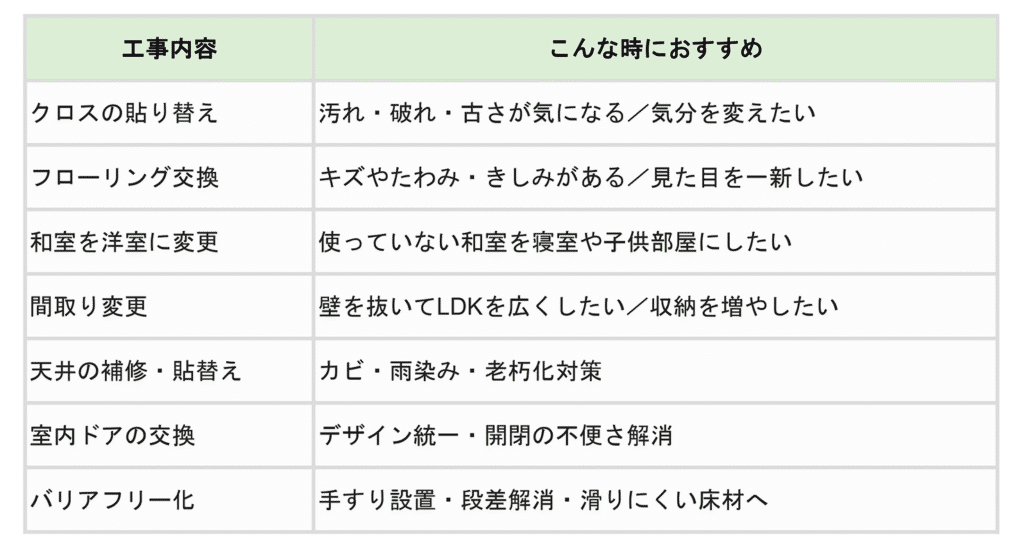 内装リフォームと一口に言っても、工事の内容や目的はさまざま。
