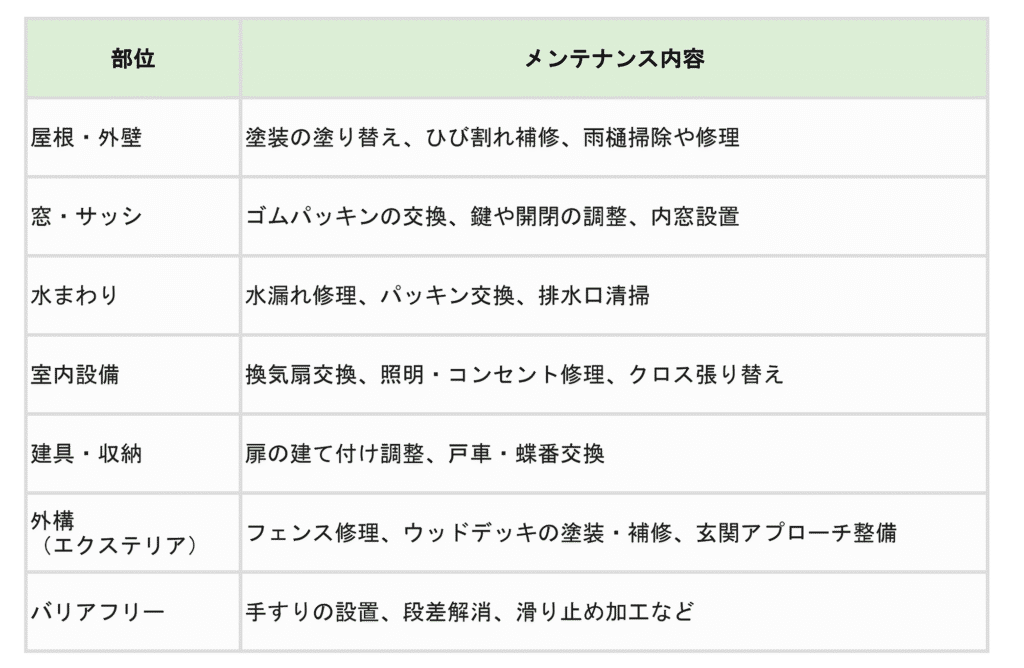 代表的な住宅メンテナンス内容は以下をご参照ください。