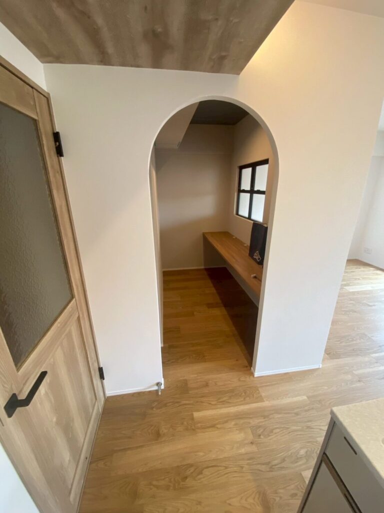 ポイントは、やわらかな雰囲気を演出するアーチ壁と可動棚つきのパントリー。